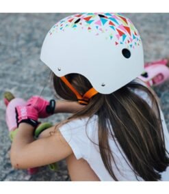 Ce casque a été conçu pour suivre les enfants dans toutes leurs activités de glisse urbaine. Que ce soit pour une balade à vélo, une session de trottinette ou une initiation au skate, sa structure robuste offre une protection fiable contre les impacts. Son esthétique originale, mêlant une base grise à des motifs triangles multicolores et des sangles orange vives, assure un look dynamique tout en augmentant la visibilité de l’enfant sur la route.