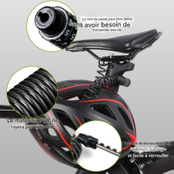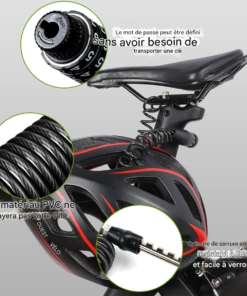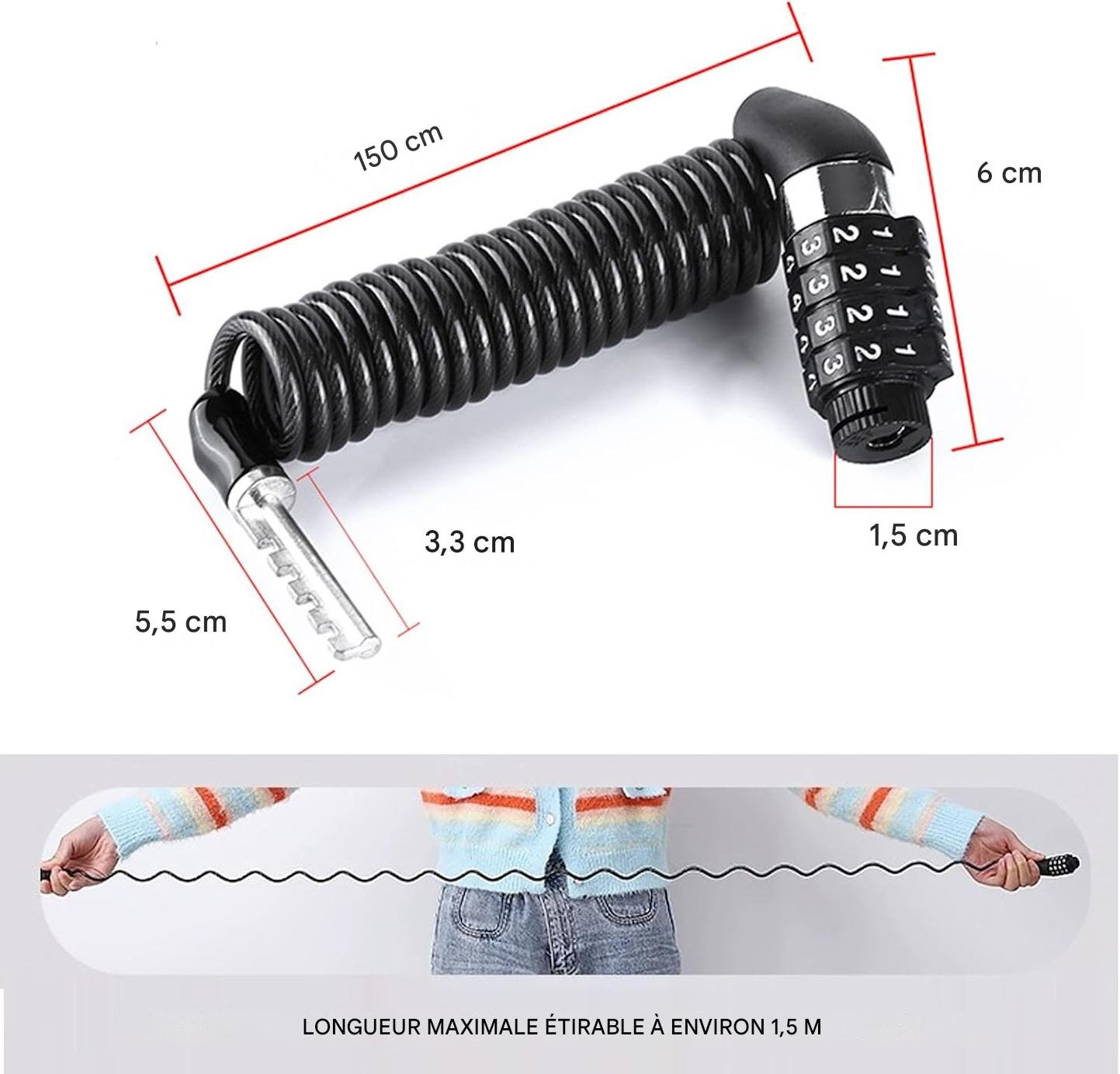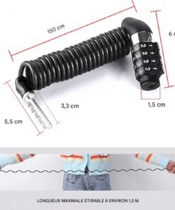 Ne vous fiez pas à sa taille initiale compacte. Une fois déployé, ce câble en acier tressé s’étire avec une souplesse remarquable jusqu’à atteindre une longueur totale d’un mètre cinquante. Cette amplitude généreuse permet d’enlacer simultanément votre casque, vos roues ou votre bagagerie.