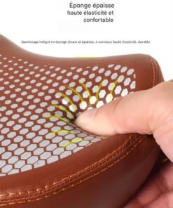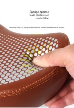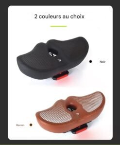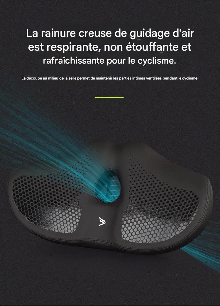 La structure de la selle intègre une zone de soulagement centrale (évidement ergonomique) qui remplit deux fonctions essentielles : elle assure une ventilation constante pour éviter la surchauffe et réduit drastiquement la pression sur les tissus sensibles. Le rembourrage en gel haute densité absorbe efficacement les chocs et les vibrations provenant des routes pavées ou des chemins accidentés, protégeant ainsi votre dos et vos articulations.
